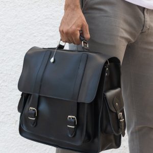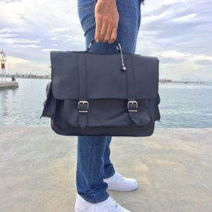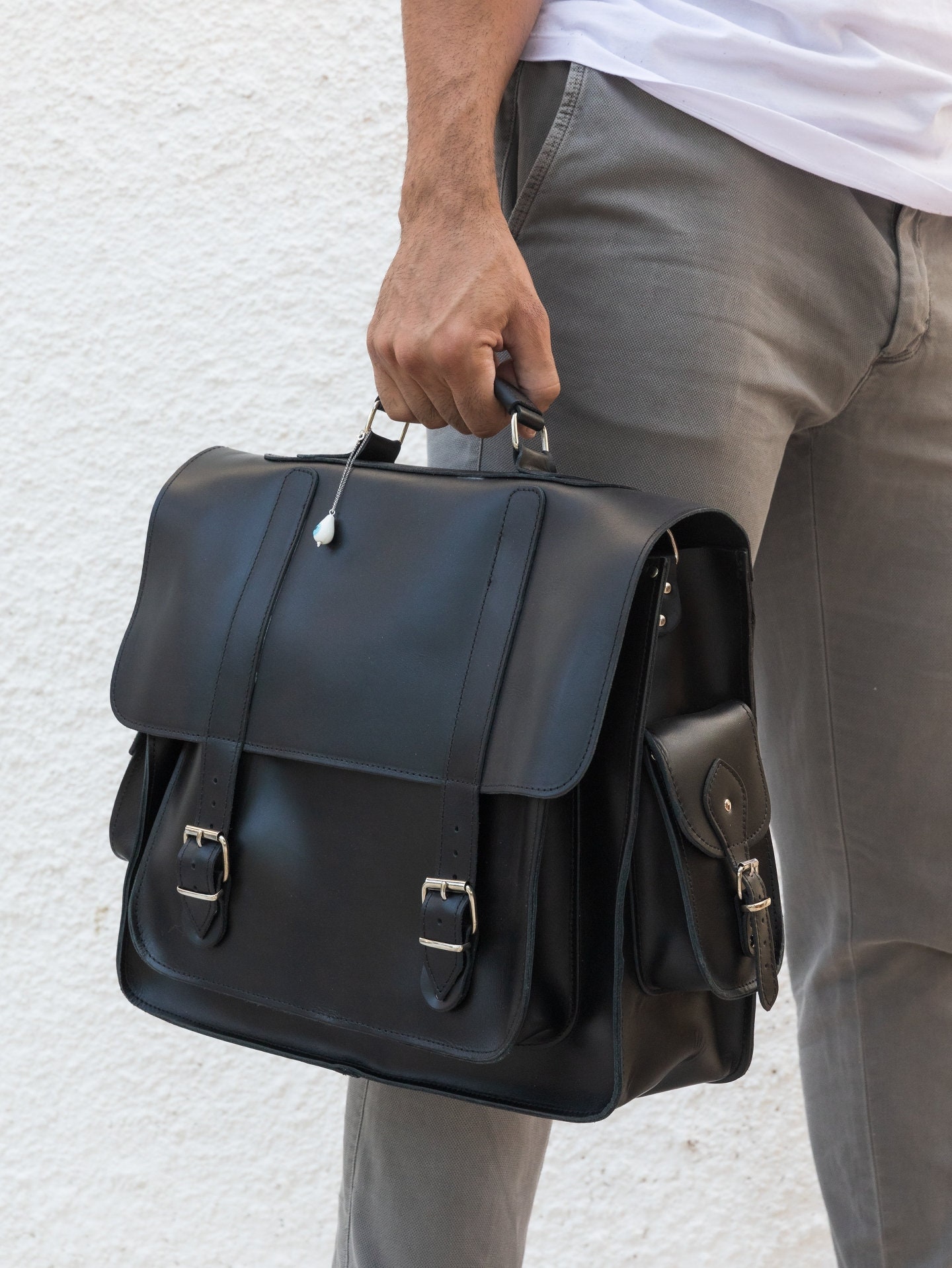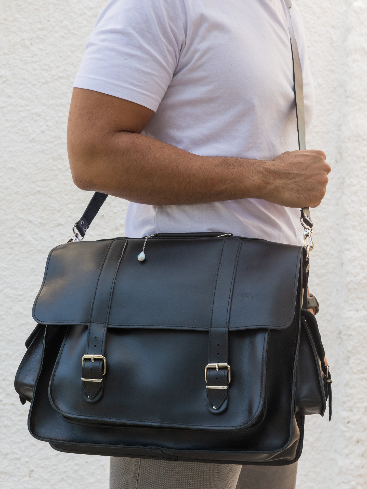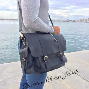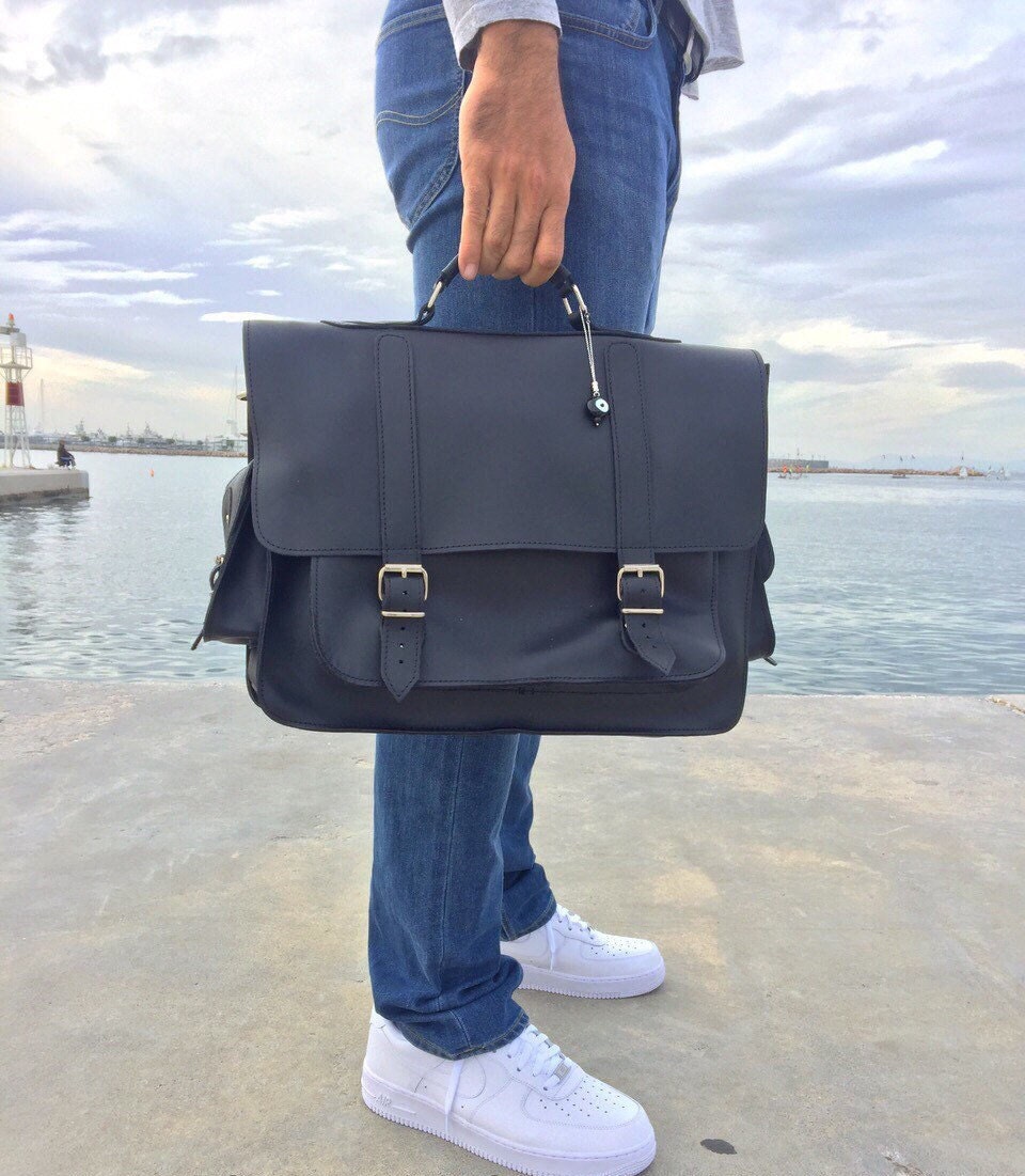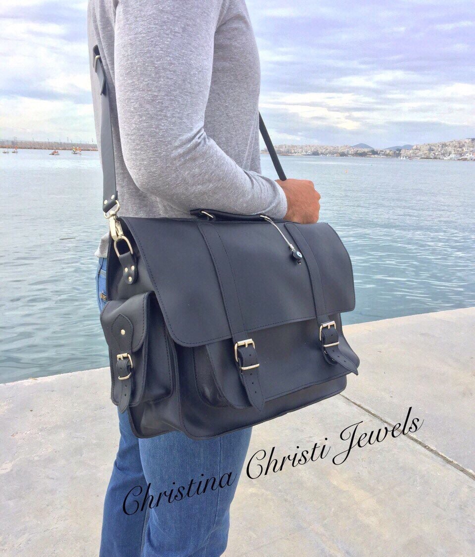Handmade leather messenger bag made from 100% genuine leather in black color decorated with a unique key ring. (At the photo the bag is the 17” Laptop Size.) Find it only at us Store.