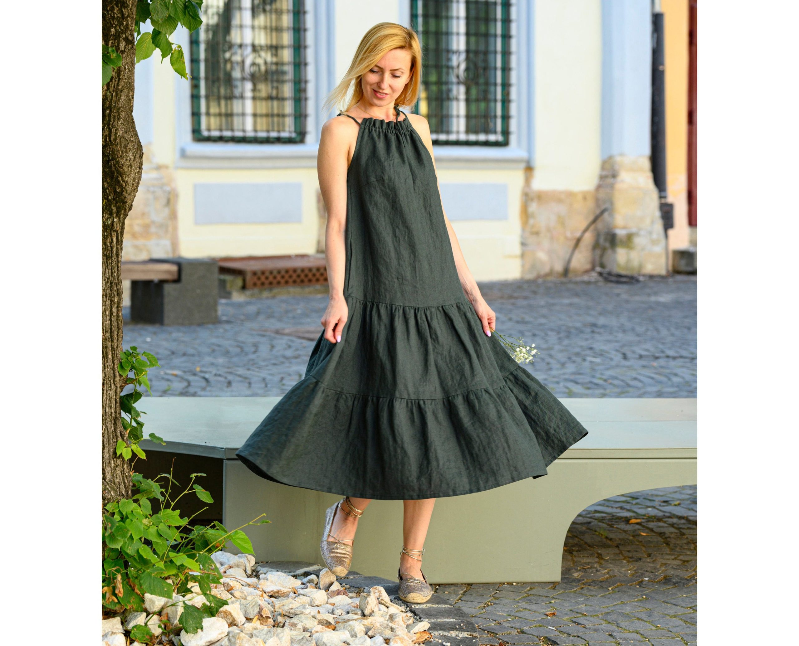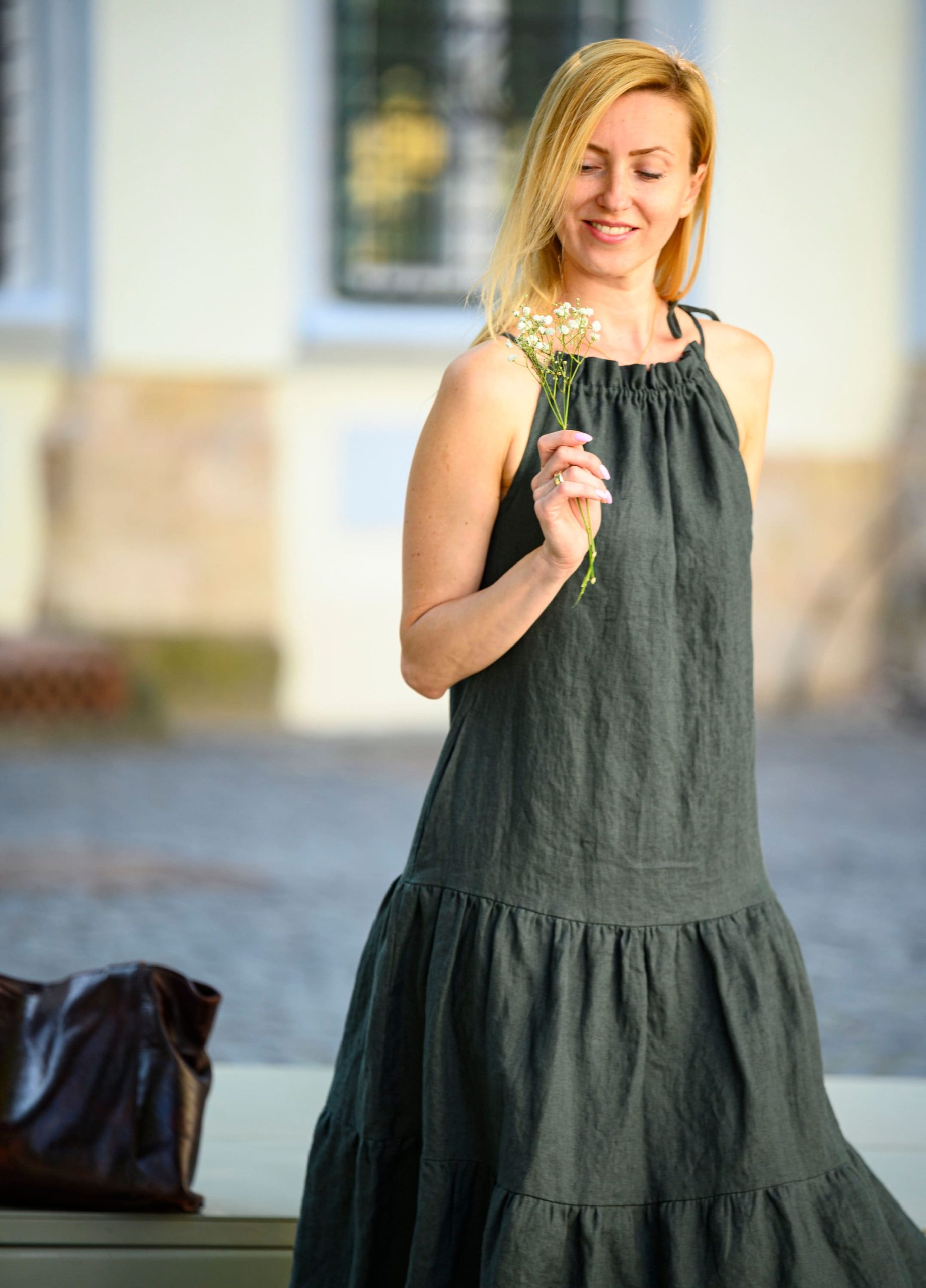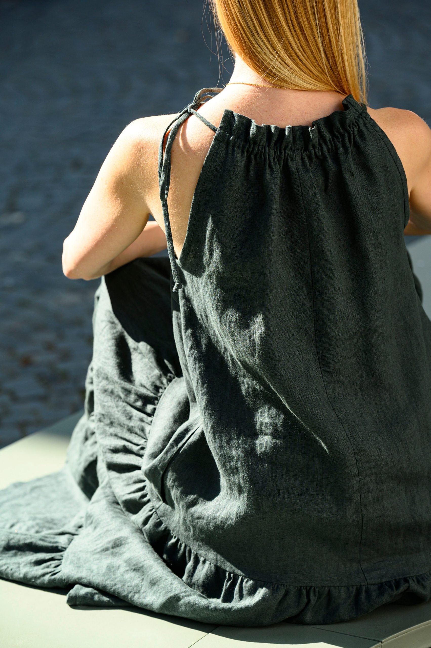 With a gentle homage to tradition, this dress brings the charm and femininity of ruffles to the modern woman. Its elongated, flared body and soft two-tier ruffles make this piece flattering to all body shapes. The upper part is styled with a high halter ruffled hem and adjustable tie straps that accentuate the shape of your shoulders. When made of soft, flowing linen, this dress becomes your true best friend for the summer!
